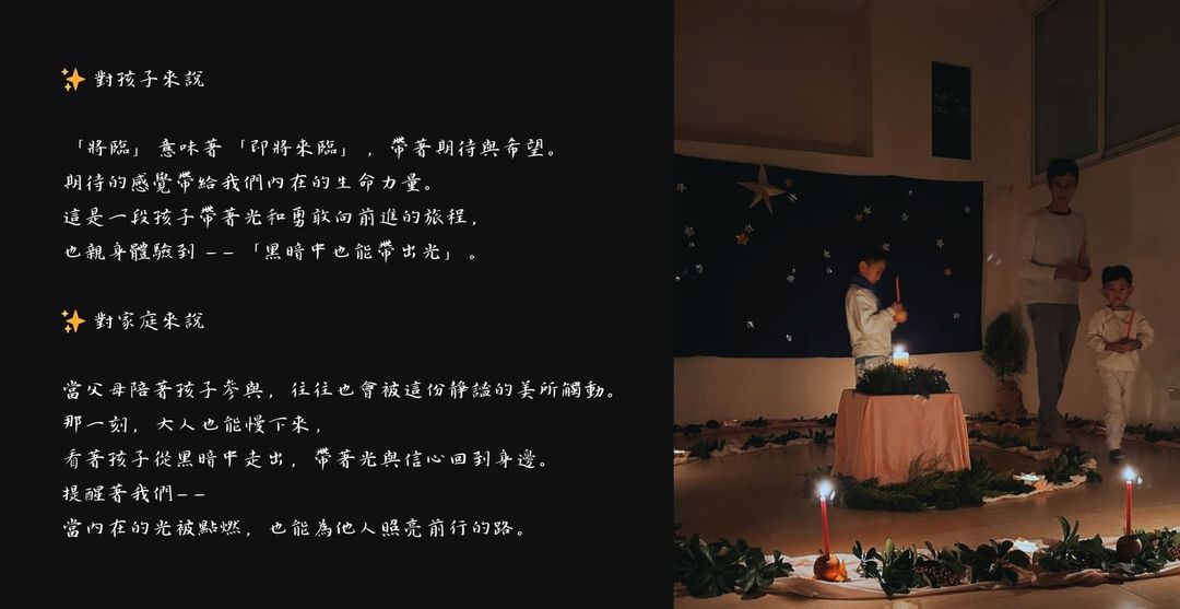 - 走螺旋儀式結束後,請與孩子好好享受這內在寧靜安穩的品質,將這份寧靜延續,並帶回家庭與生命中,晚間安靜地早早入睡。